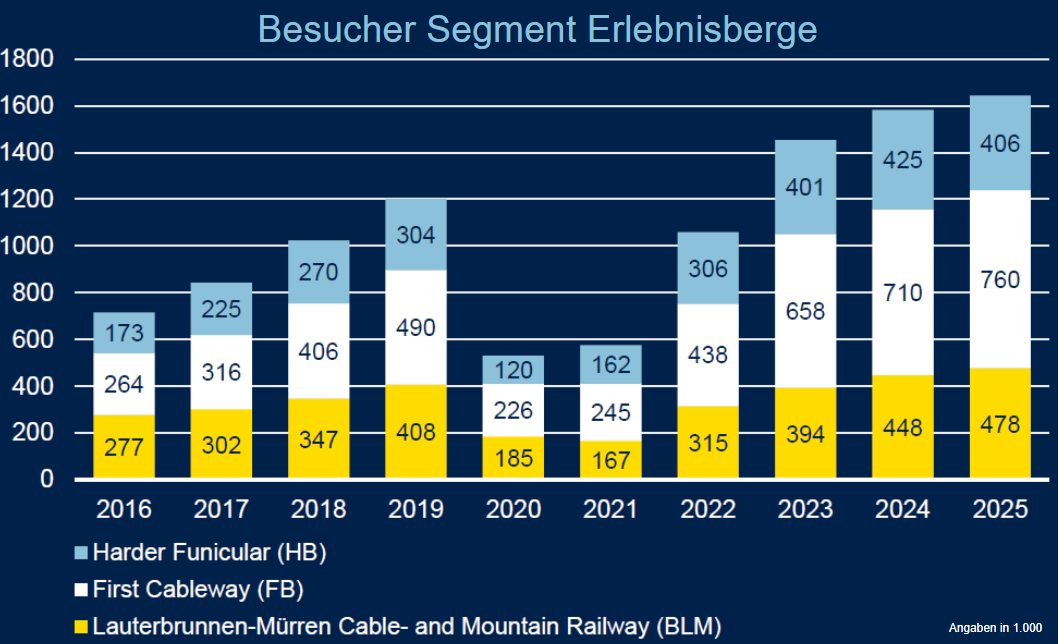 Im Vergleich zu den Erlebnisbergen hat die Jungfraubahn eine Kapazitätsgrenze, die etwa bei 5.000 Besucher pro Tag liegt. Somit ist das potenzielle Wachstum hier deutlich eingeschränkter.