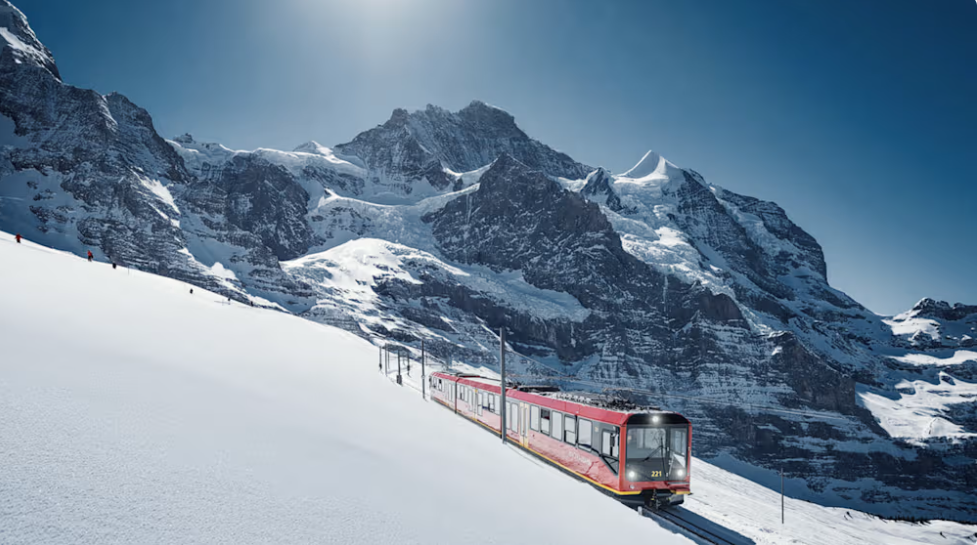 Mit Zahnradbahnen und der Jungfraubahn (siehe nachfolgendem Bild) gelangen die Gäste aus aller Welt zur bedeutendsten Attraktion der Schweiz, dem Jungfraujoch.