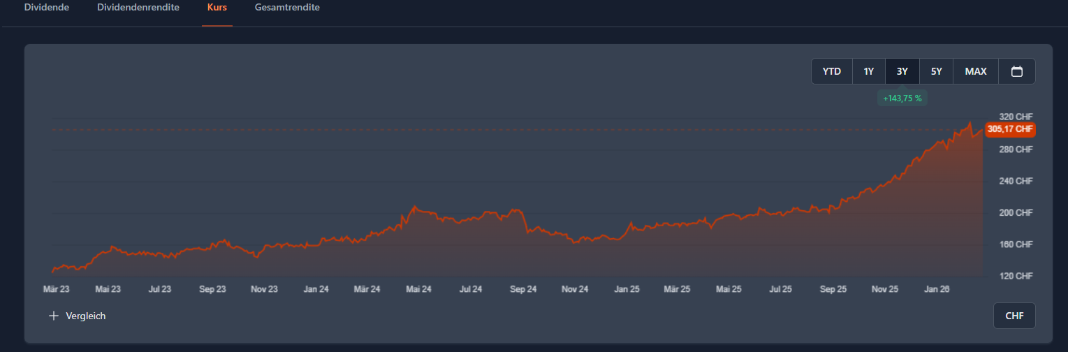 Aktuell notiert die Aktie bei 311,74 CHF (341,50 €), was einem Aufschlag von ca. 30 % gegenüber dem errechneten fairen Wert entspricht.