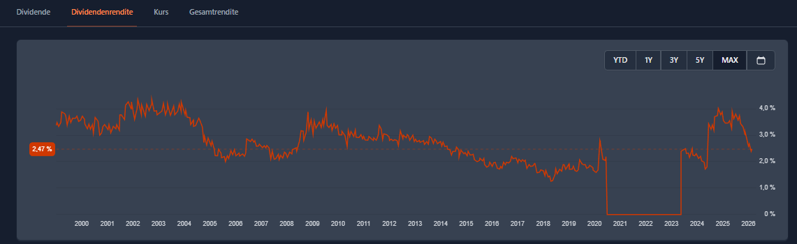 Klammert man aber die Jahre der Coronapandemie aus (2020 -2022), wo keine Dividende gezahlt wurde, wäre die aktuelle Dividendenrendite eher unterdurchschnittlich.
